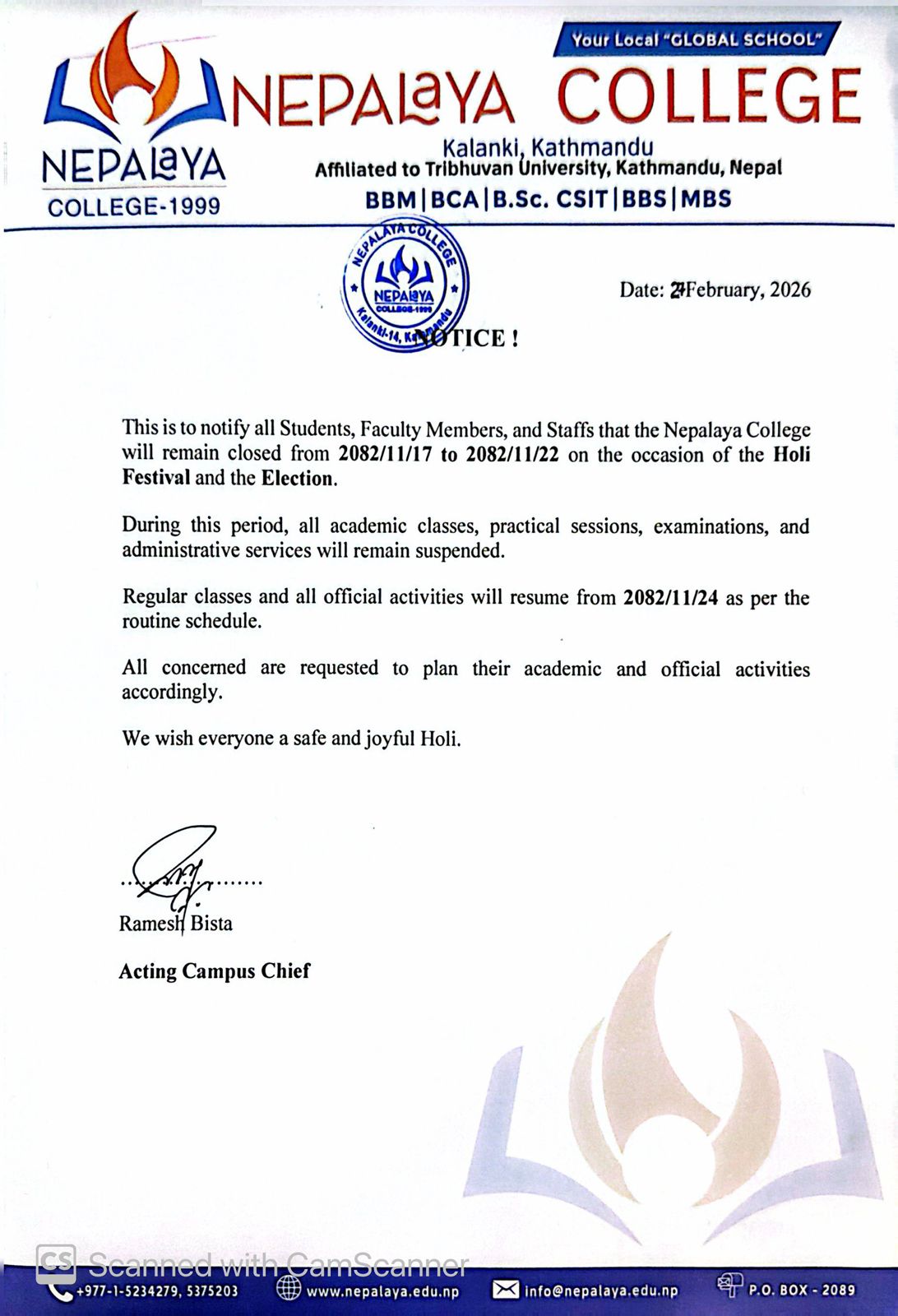 NEPALAYA College was established in 1999 A.D., in the preliminary age of modern higher secondary education system in Nepal with the purpose of offering globally accepted education to the learners in their own local area. We have been one of the prominent educational institutions in Nepal since then. As a result of our continuous and dedicated effort, presently, we are going to be a global learning center for creating global opportunities for all the learners offering distinct courses to the students in four different buildings with nearly eighty well organized classrooms. We believe in equality with diversity. Nepalaya is affiliated with Tribhuvan University (TU) to offer various courses and degrees under different level. We have various specialized and elective courses to cater the need and demand of the students in different levels of study starting from Undergraduate Programs – B.Sc. CSIT, BCA, BBM, BBS to Master Program - MBS. We believe in equality with diversity. Nepalaya is affiliated with Tribhuvan University (TU) and National Examinations Board (NEB) to offer various courses and degrees under different level.